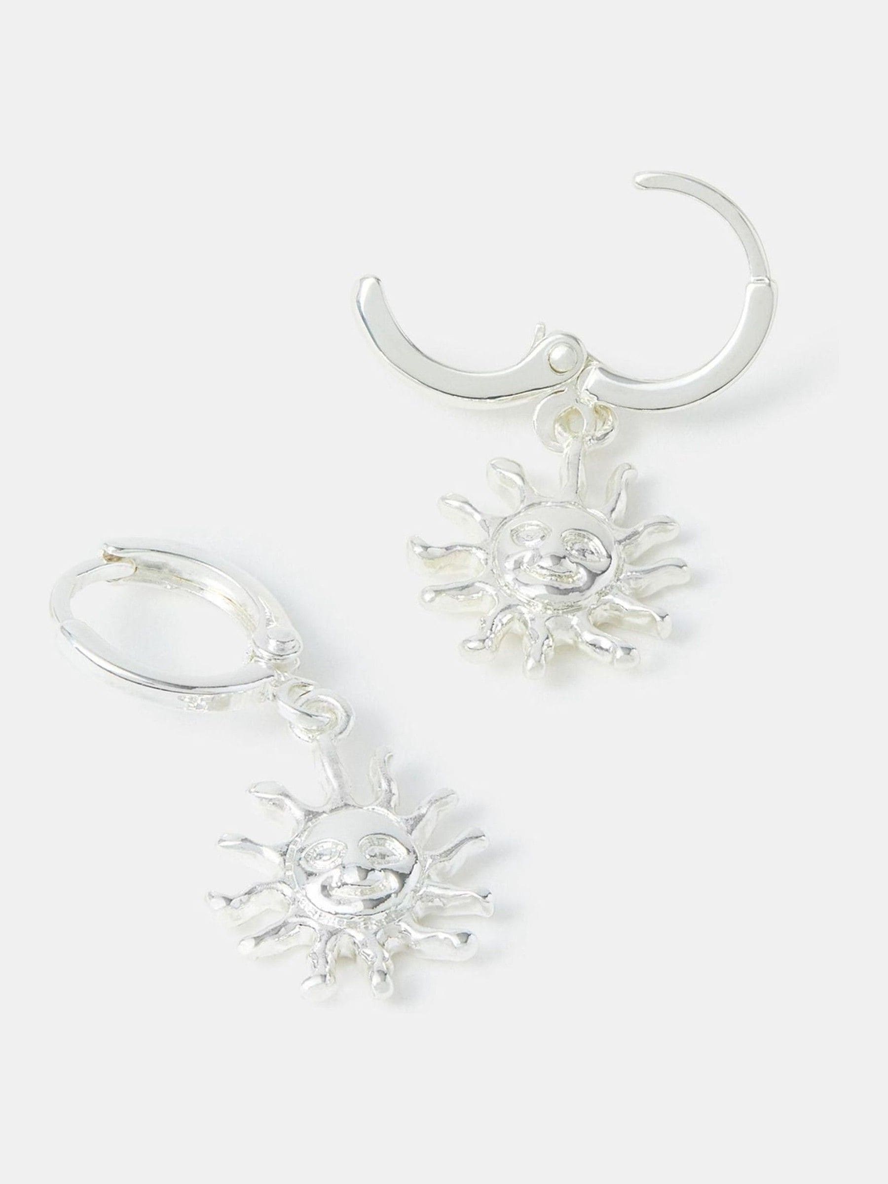 Sun worshippers: These earrings are for you! Dipped in sterling silver, these earrings feature a happy sun charm dangling from a clasp hoop profile. Non-refundable.
