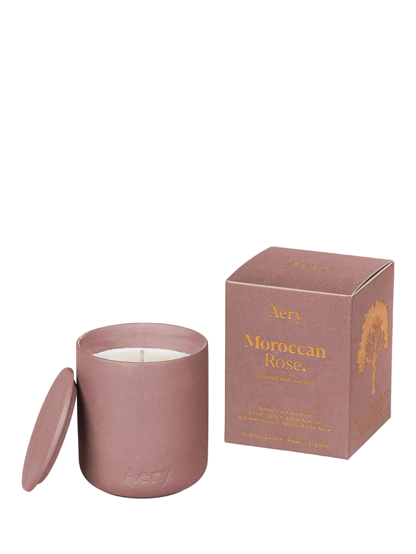 Eine samtweiche Duftkerze. Sie entführt Sie in den frühen Morgen in Marokko mit einem üppigen, erdigen Rosenduft. Fühlen Sie sich wie in einen Kokon aus riesigen, seidig-weichen Rosenblättern gehüllt. Für designorientierte Interieurs. Ein altrosa Tontopf mit passendem Deckel, der sich perfekt zum Wiederverwenden eignet. Voller Duft, der an verträumte Rosengärten und frisch gepflückte Blüten erinnert. 280 g Sojawachs.