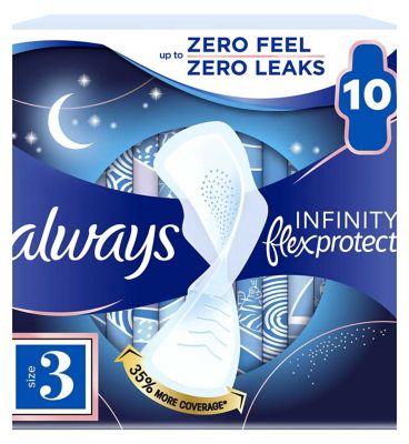 Always Infinity FlexProtect Night Binden der Größe 3 bieten optimalen Schutz über Nacht. Sie verfügen über eine besonders weiche Oberfläche und absorbieren deutlich mehr Flüssigkeit als herkömmliche Binden. Das Zero Feel Design garantiert absolute Auslaufsicherheit und sorgt für ein rundum sicheres Gefühl.