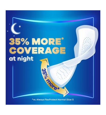 Read MoreAlways FlexProtect Night Binden sind anders konzipiert und wirken anders. Infinity FlexProtect Damenbinden bieten ein angenehmes Tragegefühl und absoluten Auslaufschutz. Sie bieten flexiblen Schutz. Sie verfügen über die weichste Oberfläche von Always und absorbieren 30 % mehr Flüssigkeit als unsere Always Ultra Tag- und Nachtbinden. Außerdem bieten Always FlexProtect Night Binden 35 % mehr Abdeckung als Always Infinity FlexProtect Größe 1. Mit Always FlexProtect Binden können Sie Ihre Periode ganz entspannt genießen.