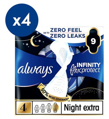 Always Infinity FlexProtect Damenbinden Größe 4 mit extra Flügeln bieten optimalen Schutz über Nacht. Dank der FlexProtect-Technologie fühlen sich diese Binden angenehm weich an. Genießen Sie maximale Sicherheit durch 50 % mehr Abdeckung und hohe Saugfähigkeit. Dieses Set garantiert zuverlässigen, komfortablen und auslaufsicheren Schutz in der Nacht.