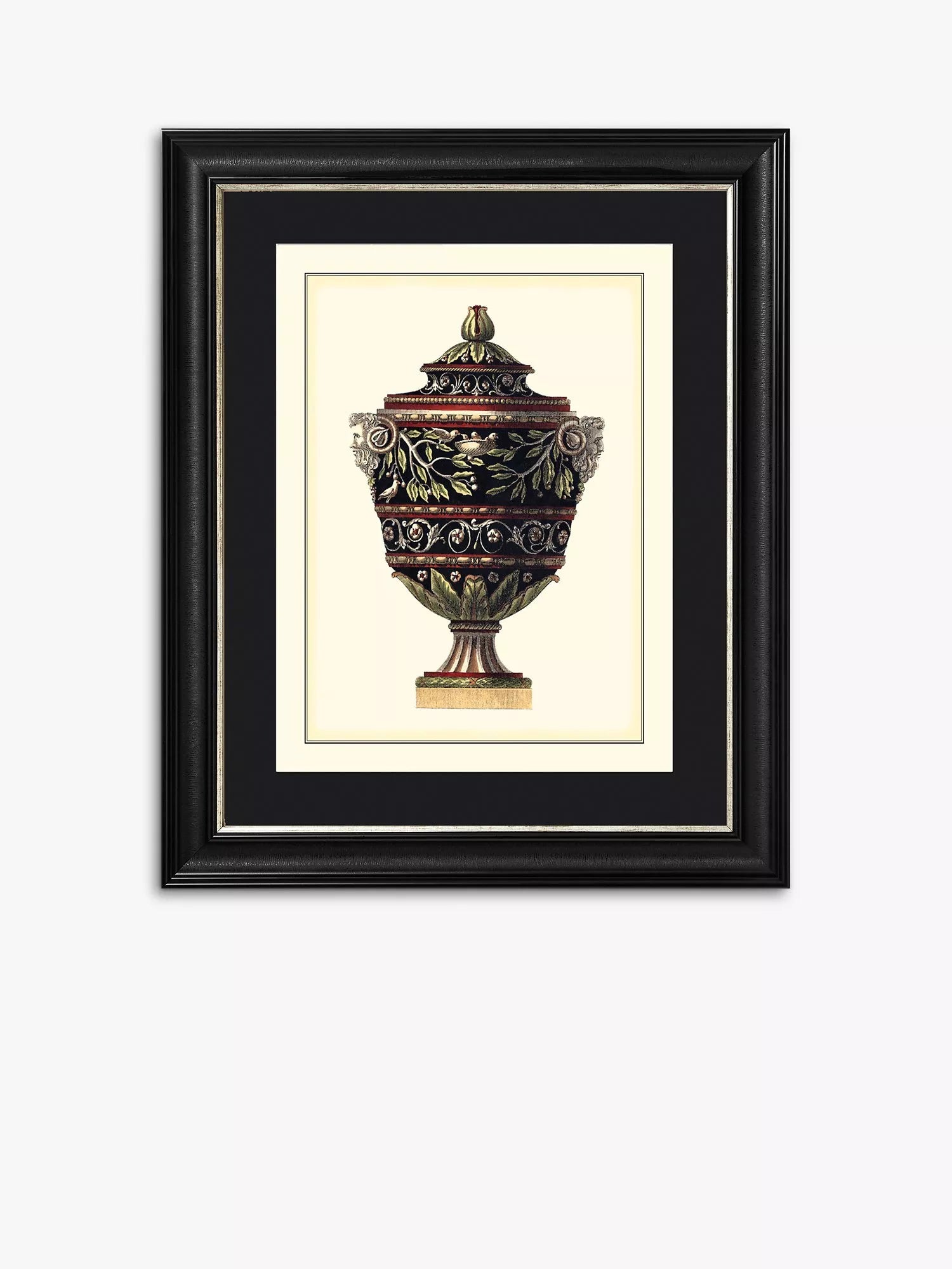 Eine detaillierte Abbildung einer dekorativen Urne, gedruckt auf Satinfotopapier und gerahmt in einer schwarz-antikzinnfarbenen Leiste. Der Rahmen besteht aus einem recycelten Holzverbundwerkstoff und hat ein schwarzes Passepartout mit weißem Kern.