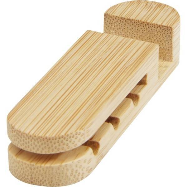 Material: Bambus, Länge: 90 mm, Breite: 24 mm, Höhe: 18 mm, kann als Handyhalterung verwendet werden.