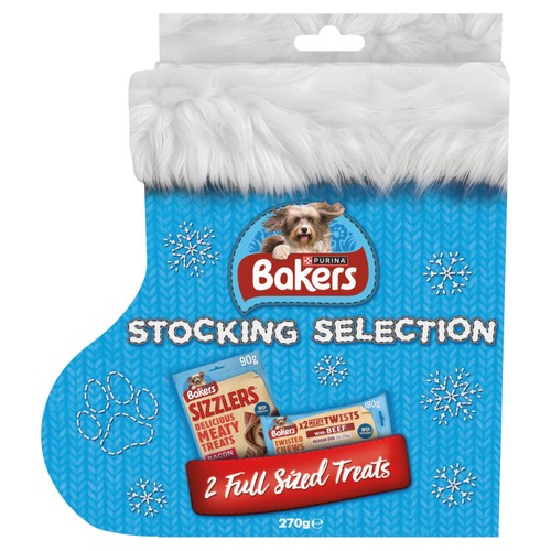 Present the BAKERS Christmas Edition Treat Stocking as a festive offering for your dog this season. This limited edition item is designed to give your furry friend the appropriate celebration treat they deserve. It contains two bags of treats offering varied textures and appealing flavours.