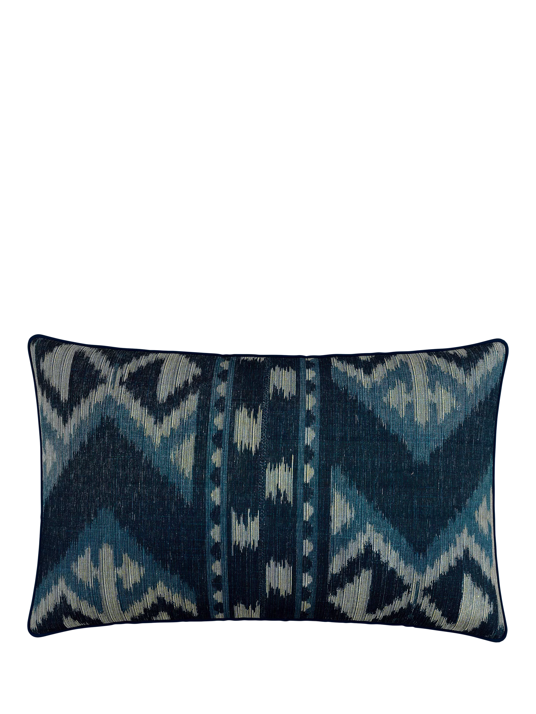 Die Dhaka-Kollektion ist von antiken Teppichmustern inspiriert und besticht durch einen zarten, malerischen Look. Dieses bedruckte Kissen hat ein Ikat-Muster und eine farblich abgestimmte Paspelierung.