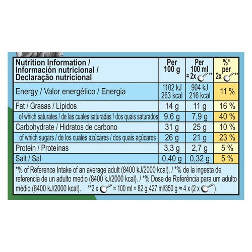 Water, sugar, cream (MILK) (18%), concentrated skimmed MILK, glucose syrup, coconut fat, free range EGG yolk, vegetable oils (rapeseed, sunflower), cocoa powder, skimmed MILK powder, fat-reduced cocoa powder, butter fat (MILK), whey powder (MILK), modified corn starch, salt, caramelised sugar, stabilisers (guar gum, carrageenan, locust bean gum), emulsifiers (lecithins (contain SOY)), molasses, BARLEY malt extract, sea salt, natural flavourings, acidity regulator (citric acid). > Fairtrade cocoa, sugar, vanilla. Sugar and vanilla with mass balance. Total 53% excluding water and dairyF. FVisit info.fairtrade.net/sourcing. ∆ cocoa sourced via Open Chain total: 100%