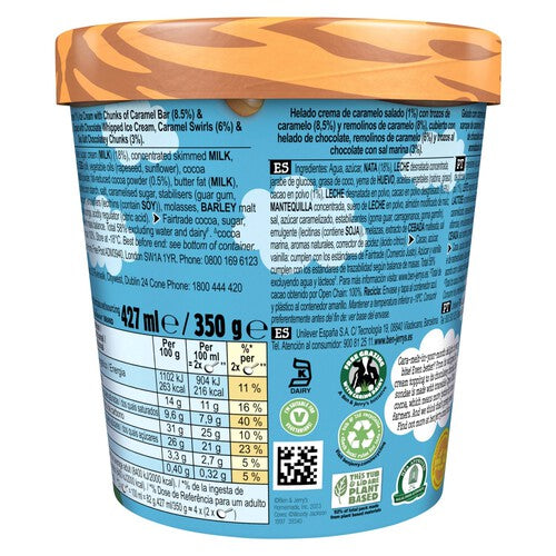 Prepare for a truly spectacular frozen dessert experience with this multi-textured tub. At its core lies rich, decadent salted caramel ice cream, providing the perfect sweet and savory base. Embedded within are satisfying chunks of gooey caramel bar, ensuring every scoop delivers contrast and crunch. This indulgence is crowned with a layer of luscious chocolate whipped ice cream, which is then swirled with even more caramel and studded with chocolatey chunks. We are proud that the cocoa used in this recipe is sourced via traceable open-chain methods, ensuring better futures for cocoa farmers. Perfect for freezing and enjoying straight from the tub, this complex sundae is ready to satisfy your deepest cravings.