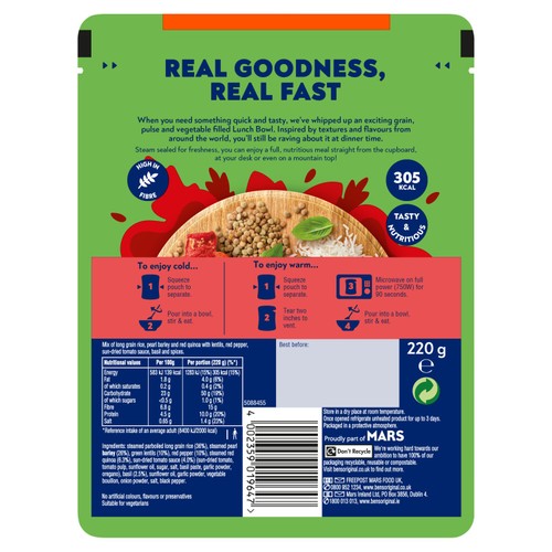 Ben's Original Lunch Bowl features an Italian style ready meal ideal for one person. It is a delicious, high fibre microwave rice meal combining grains, pulses, and vegetables. Inspired by global textures and flavours, this bowl is perfect for a quick lunch at the office or a fast dinner solution.