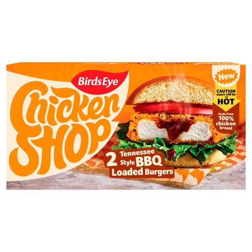 These Birds Eye Chicken Shop burgers feature a Tennessee Style BBQ coating and flavour profile. The product is supplied frozen for convenient storage and later preparation. Note that the '100% chicken breast' claim refers only to the meat component used in the burger.