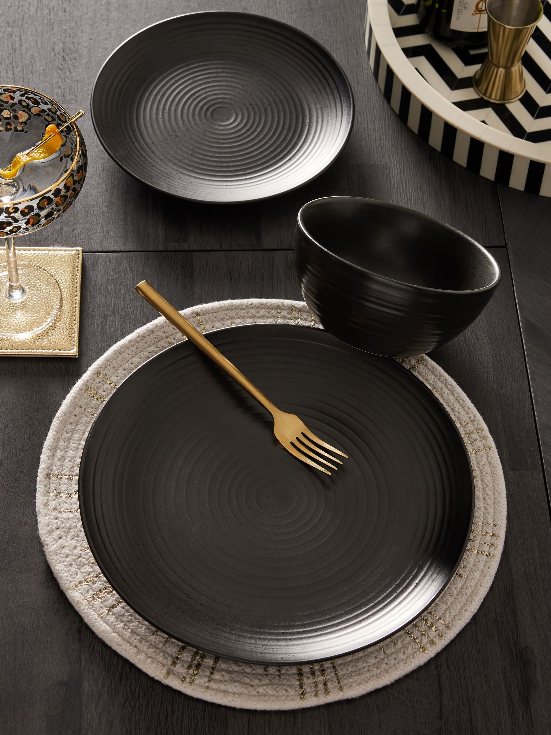 Unser schwarzes Bronx-Geschirrset besticht durch ein modernes, seidenmattes Finish mit sanftem Wellenmuster und dezenten Sprenkeln. Es umfasst vier Speiseteller, vier Dessertteller und vier Schüsseln. Dieses Geschirrset aus robustem und praktischem Steinzeug ist die perfekte Lösung für jeden Essbereich und zudem spülmaschinenfest.
