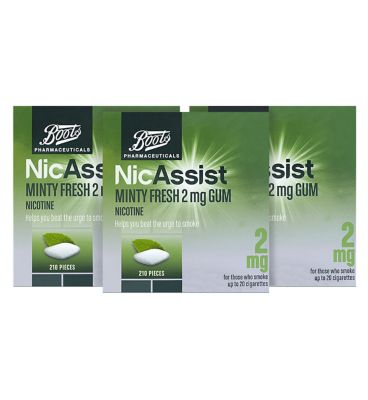 Drei Packungen Boots NicAssist Minty Fresh 2mg Kaugummi helfen Ihnen, das Verlangen nach Zigaretten zu überwinden. Für Raucher von bis zu 20 Zigaretten pro Tag. Bitte lesen Sie die Packungsbeilage. Willenskraft erforderlich.