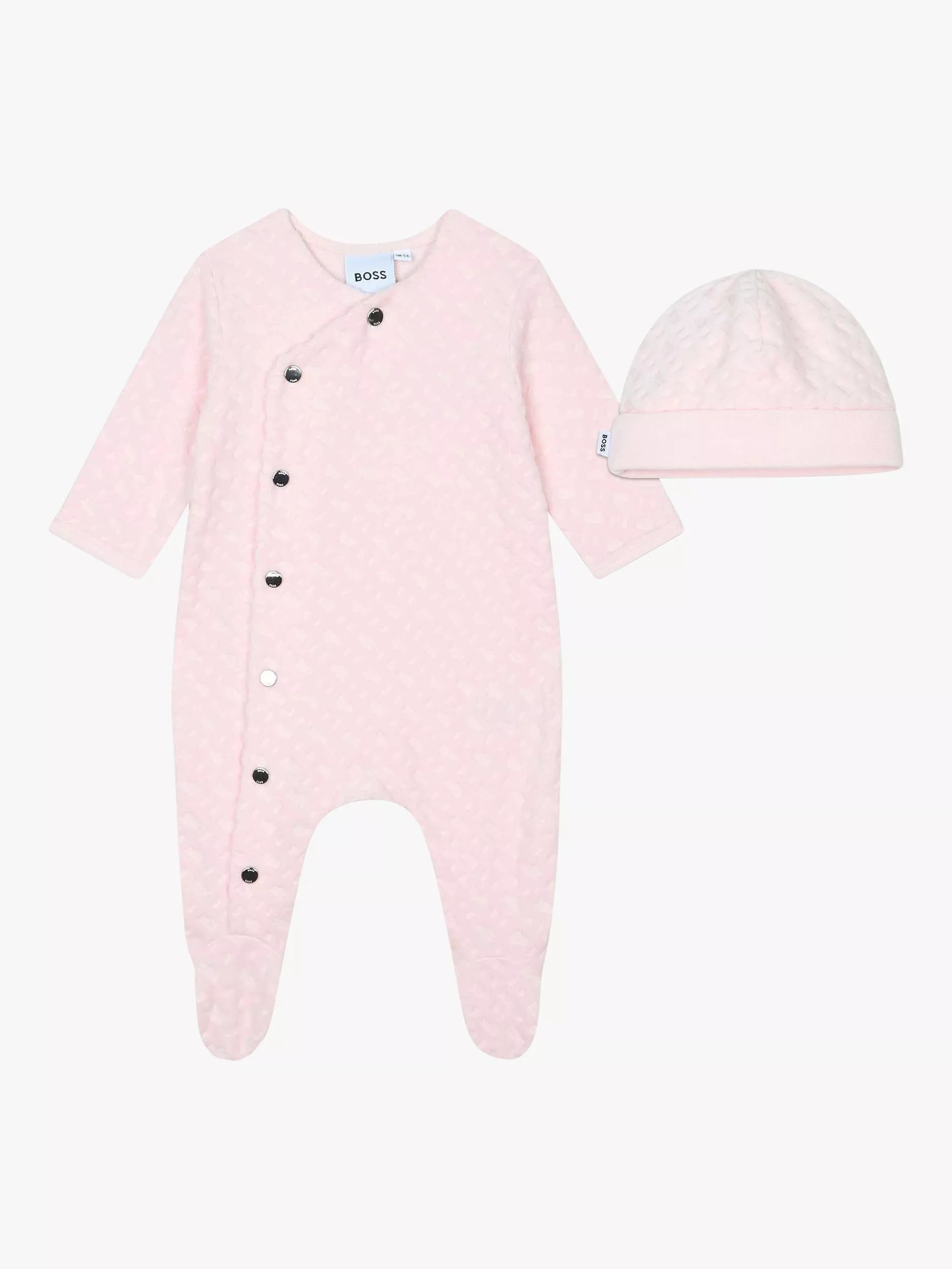 Kuscheln Sie Ihr Baby in luxuriösen Komfort mit diesem bezaubernden Schlafanzug- und Mützenset von BOSS Baby. Gefertigt aus weichem Bio-Baumwoll-Jacquard-Samt, ist es perfekt für zarte Babyhaut und süße Träume.