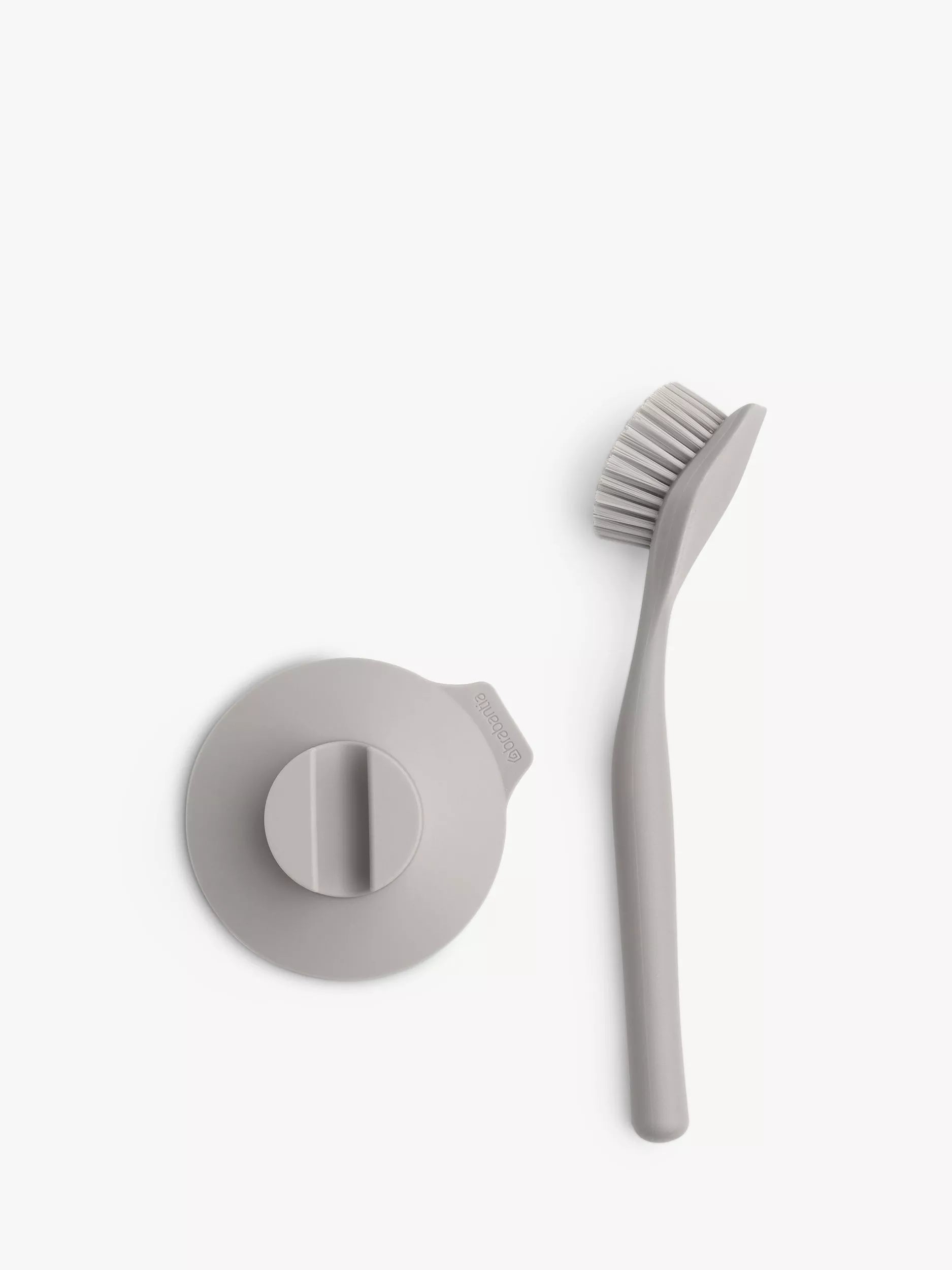 Diese robuste Spülbürste verfügt über einen sicheren Griff, einen integrierten Schaber und einen Saugnapfhalter, damit sie direkt in Ihrer Spüle jederzeit einsatzbereit ist.