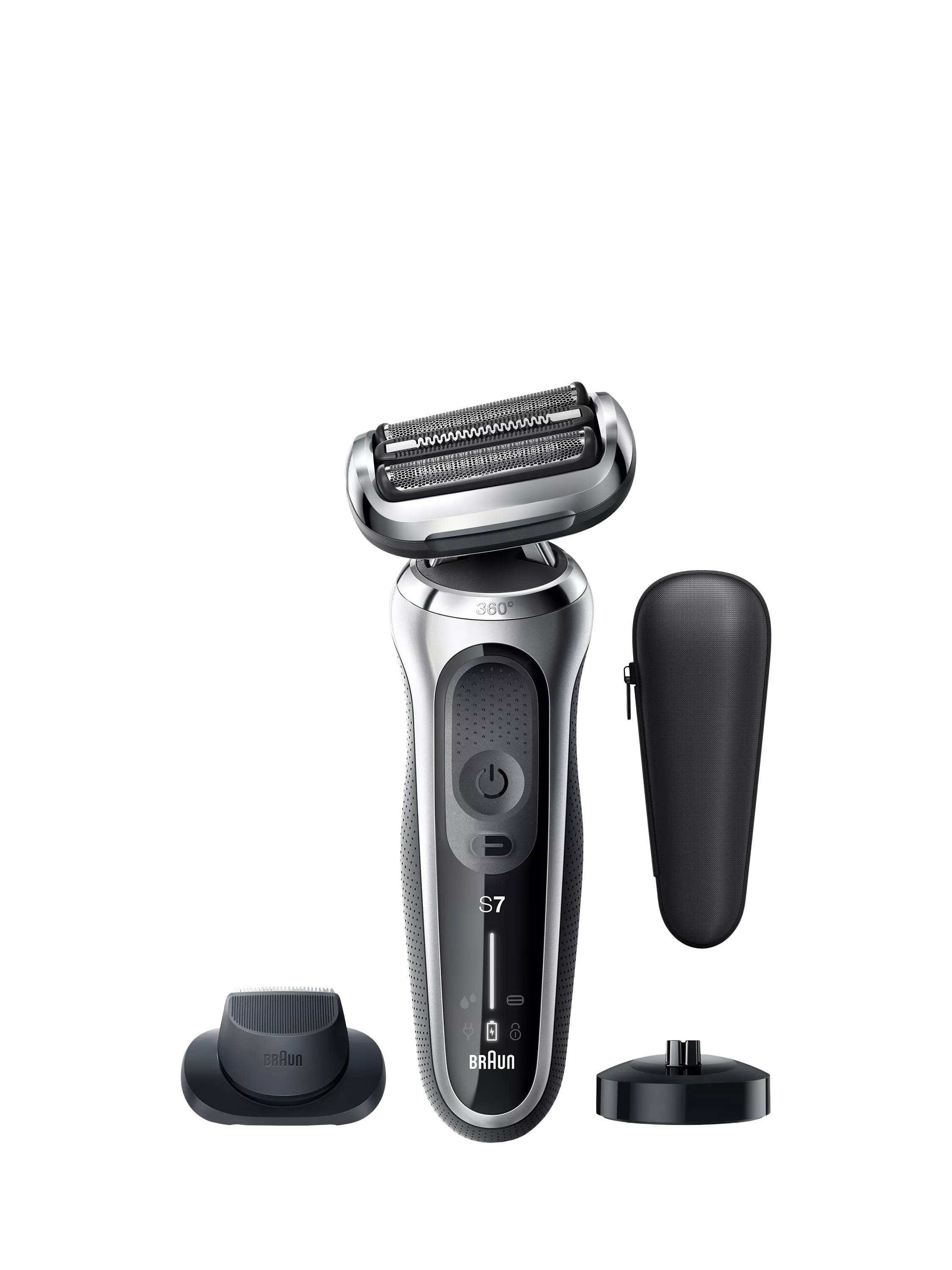 Der Braun Series 7 Elektrorasierer für Herren mit 360°-Anpassung für eine besonders gründliche Rasur. Die Autosense-Technologie erkennt Ihre Bartdichte und passt den Rasierer automatisch an, um mehr Haare pro Zug zu entfernen. Der Lithium-Ionen-Akku ermöglicht bis zu 3 Wochen Rasiervergnügen und ist in nur 5 Minuten schnell wieder aufgeladen. Dieser Elektrorasierer ist 100 % wasserdicht und somit für die Nass- und Trockenrasur geeignet. Er ist mit dem EasyClick-System kompatibel. Ein Präzisionstrimmer-Aufsatz ist im Lieferumfang enthalten. Lieferumfang: 1x Series 7 Elektrorasierer für Herren – Silber, 1x Präzisionstrimmer-Aufsatz, 1x Ladestation, 1x Reiseetui, 1x Smart-Stecker für automatische Spannungsanpassung (100–240 V), 1x Reinigungsbürste