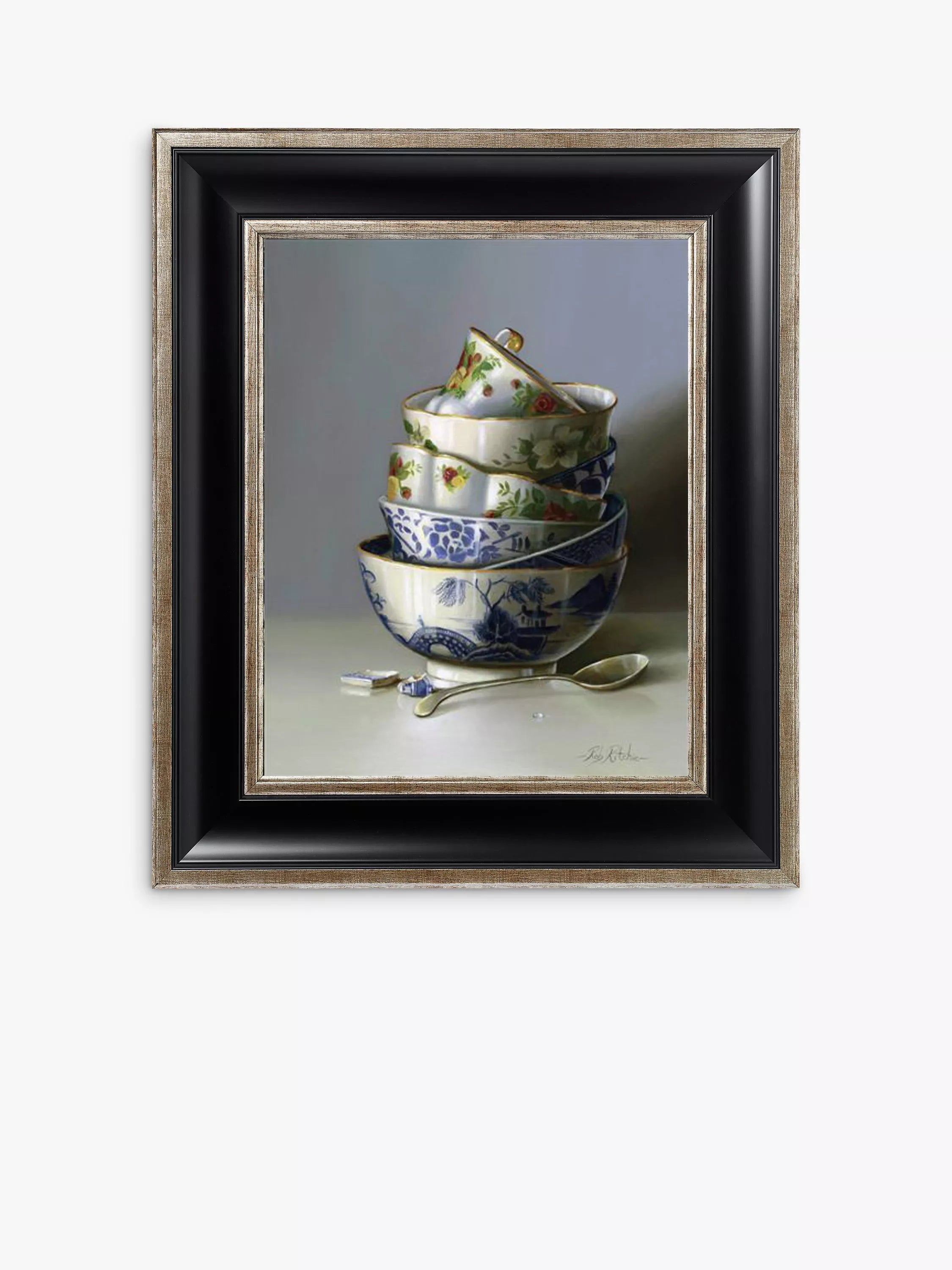 Bring a touch of elegant artistry to your home with this captivating framed canvas print. Featuring a beautiful still life of patterned china, this piece adds a sophisticated touch to any room. Its dark wood-effect frame with a gold inner rim provides a classic and timeless look.