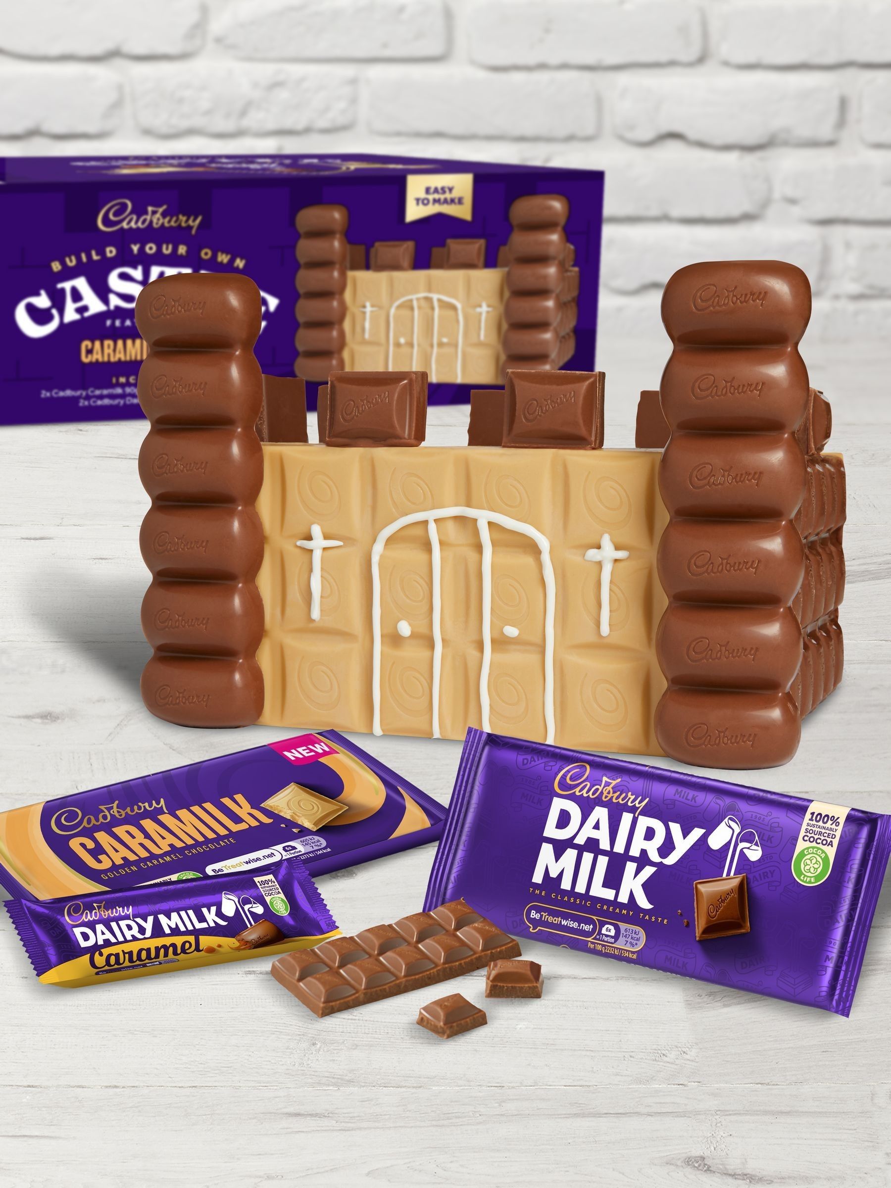 Make your own Castle Kit contains 2 x Cadbury Dairy Milk Bar 95g, 2 x Cadbury Caramilk Chocolate Bar 90g and 2 x Cadbury Dairy Milk Caramel Bar 45g.