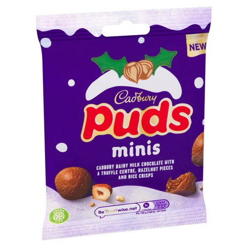 Cadbury Dairy Milk Chocolate with a Truffle Centre, Hazelnut Pieces and Rice Crisps Your Favourite Festive Pud Now in a Mini Size Suitable for vegetarians