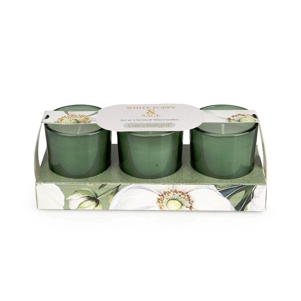 Duftrichtung Weißer Mohn-Salbei, 3er-Set Votivkerzen, Brenndauer je Kerze ca. 8 Stunden, getöntes Glas, Maße je Kerze: H 6 cm x B 5 cm. Die Votivkerzen aus wunderschönem, farbigem Glas erzeugen ein warmes und einladendes Licht, das die Atmosphäre jedes Raumes in Ihrem Zuhause perfekt unterstreicht. Mit ihren belebenden Blumendüften verspricht dieses Set, Ihre Stimmung zu heben und Ihr Zuhause mit einem lang anhaltenden, bezaubernden Duft zu erfüllen. Ideal für den Alltag und besondere Anlässe. Diese Votivkerzen sind eine stilvolle Ergänzung für jede Einrichtung und erfüllen den Raum mit einem erfrischenden blumig-zitrischen Duft. Perfekt verpackt in einer eleganten Box, ist dieses Set ein ideales Geschenk oder eine wunderbare Bereicherung für Ihre eigene Dekoration.