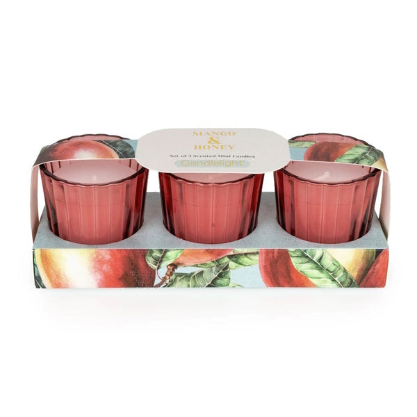 Duftset Mango-Honig, 3er-Set Votivkerzen, Brenndauer je Kerze ca. 8 Stunden, getöntes, geripptes Glas, Maße je Kerze: H 6 cm x B 55 cm. Die Votivkerzen aus wunderschönem, getöntem Glas verströmen ein warmes und einladendes Licht und schaffen eine angenehme Atmosphäre in jedem Raum. Mit ihrem belebenden, fruchtigen Duft verspricht dieses Set, Ihre Stimmung zu heben und Ihr Zuhause mit einem lang anhaltenden, bezaubernden Duft zu erfüllen. Ideal für den Alltag und besondere Anlässe. Die Votivkerzen sind eine stilvolle Ergänzung für jede Einrichtung und erfüllen die Luft mit einem erfrischenden, blumig-zitrischen Duft.