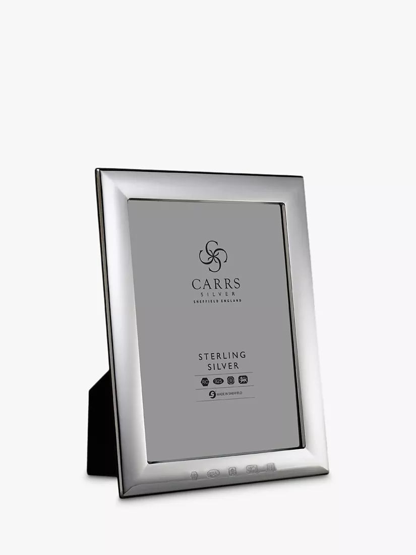 Der in England gefertigte Bilderrahmen Carrs Sloane besticht durch sein klassisches Design und ist aus punziertem Sterlingsilber. Er wird in einer eleganten Geschenkbox geliefert und kann freistehend, vertikal oder horizontal aufgestellt werden.
