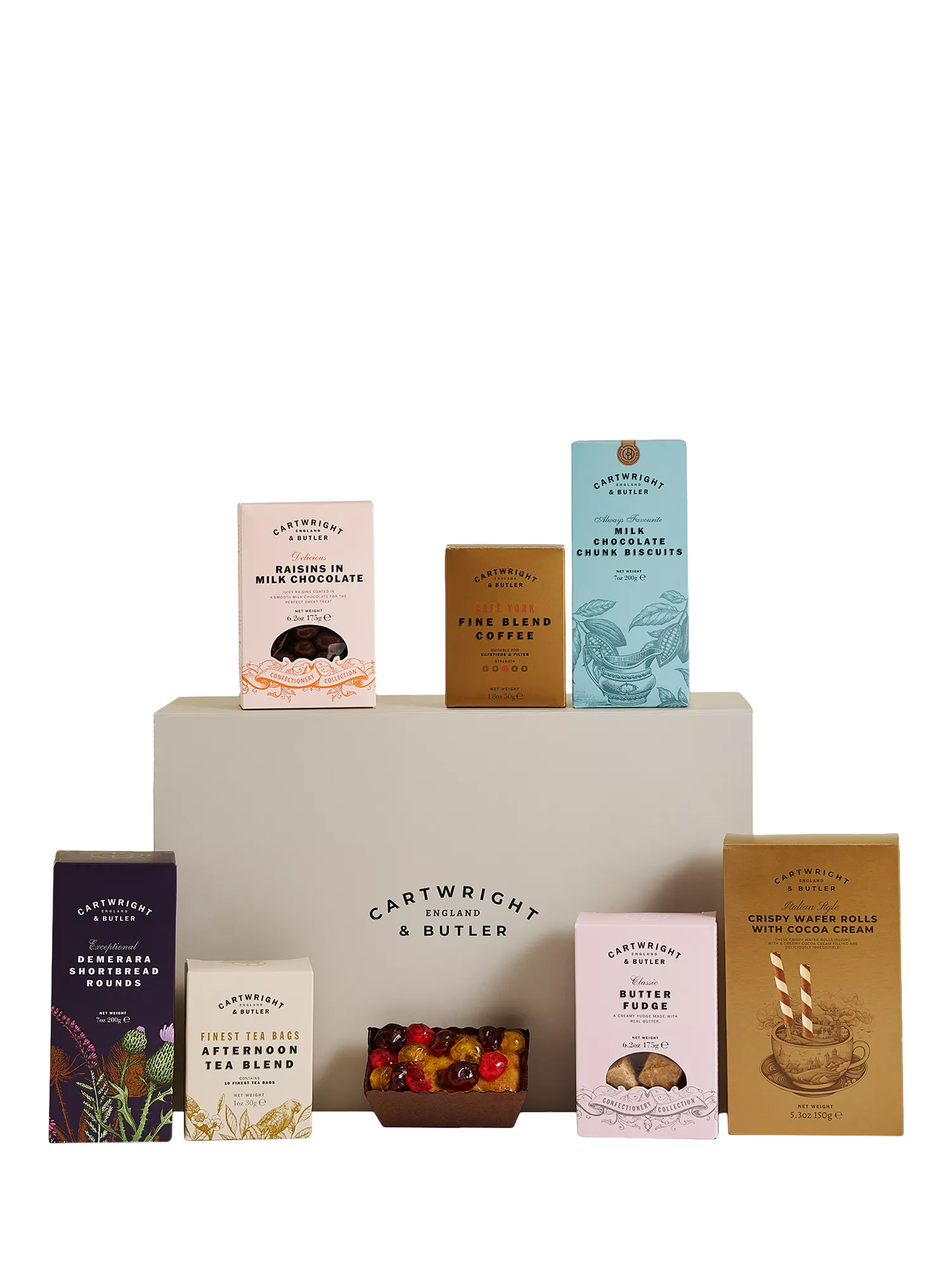 Wer liebt nicht einen guten Nachmittagstee? Diese fabelhafte Auswahl von Cartwight & Butler beinhaltet: Tee und Kaffee, eine Auswahl an Schokoladen-, Streusel- und Shortbread-Keksen sowie einen reichhaltigen Mini-Früchtekuchen.