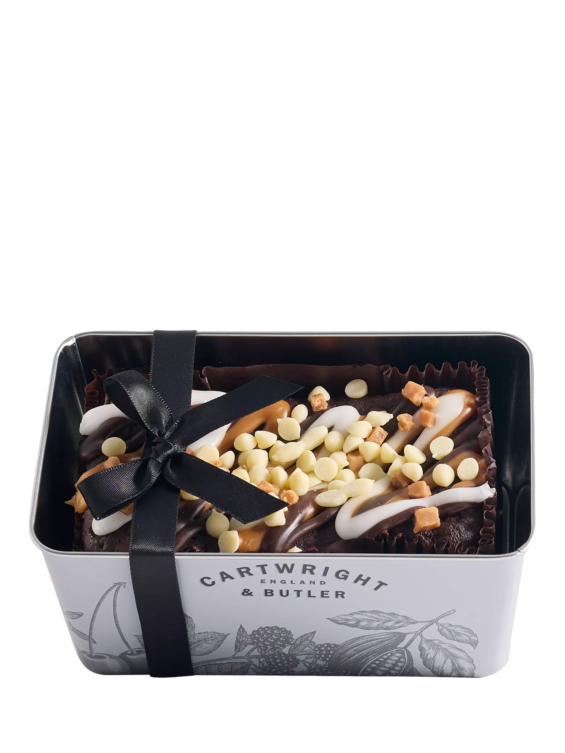 Samtig-cremiger Schokoladenkuchen mit Schokoladenstückchen, beträufelt mit weißer und Vollmilchschokolade und gekrönt mit zartschmelzenden Karamellstückchen.