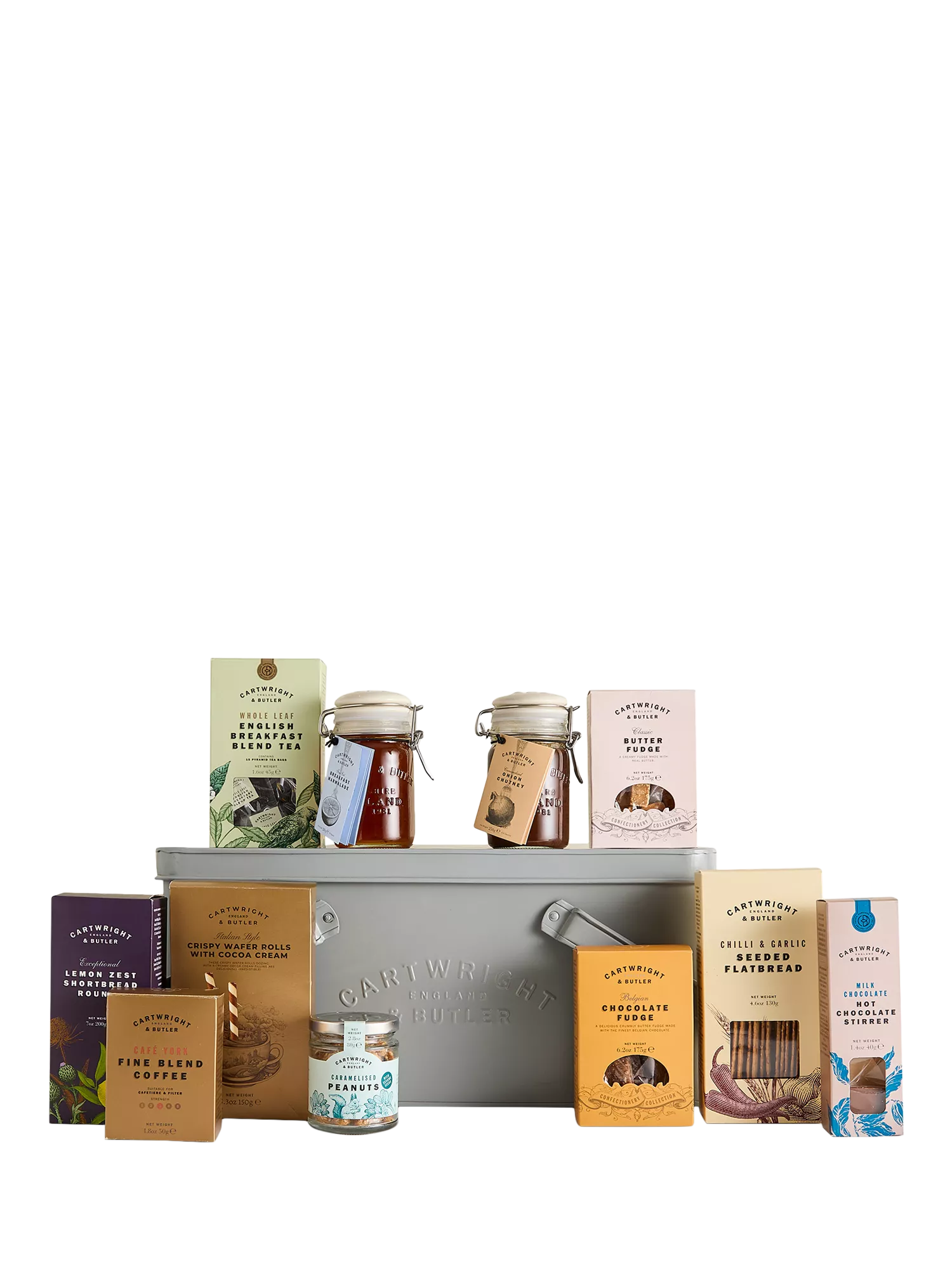 Der Bestseller von Cartwright & Butler, der luxuriöse Picknickkorb „Pocklington“, ist eine köstliche Auswahl feinster Leckereien in einer eleganten, klassischen Dose. Entdecken Sie diese köstliche Kollektion mit einem vollmundigen, traditionellen englischen Frühstückstee und einer mittelstark gerösteten Kaffeemischung der Café York-Mischung – perfekt zubereitet für einen warmen Start in den Tag. Freuen Sie sich auf eine Vielfalt an süßen und herzhaften Köstlichkeiten, von Fladenbrot mit süßer Chili-Note, karamellisiertem Zwiebel-Chutney und karamellisierten Sesam-Erdnüssen bis hin zu knusprigem Zitronen-Shortbread, knusprigen Waffelröllchen mit Kakaocreme und Butterfudge – für jeden Geschmack ist etwas dabei.