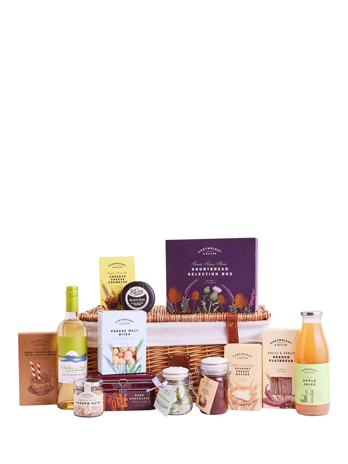 In your Cartwright and Butler picnic hamper, you'll find a little treat for everyone, from savoury biscuits to sweets. And to wash it all down there's a natural fruit juices.