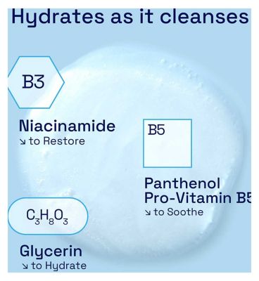 • Cleanser hydrates as it washes, soothing and replenishing skin moisture.