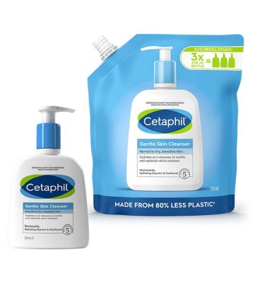 This Cetaphil Gentle Skin Cleanser refill bundle provides a trusted solution for daily cleansing. It is formulated for normal to dry and sensitive skin types, offering hydration while washing. The bundle pairs the classic cleanser with an eco-refill pouch to minimise packaging waste effectively.