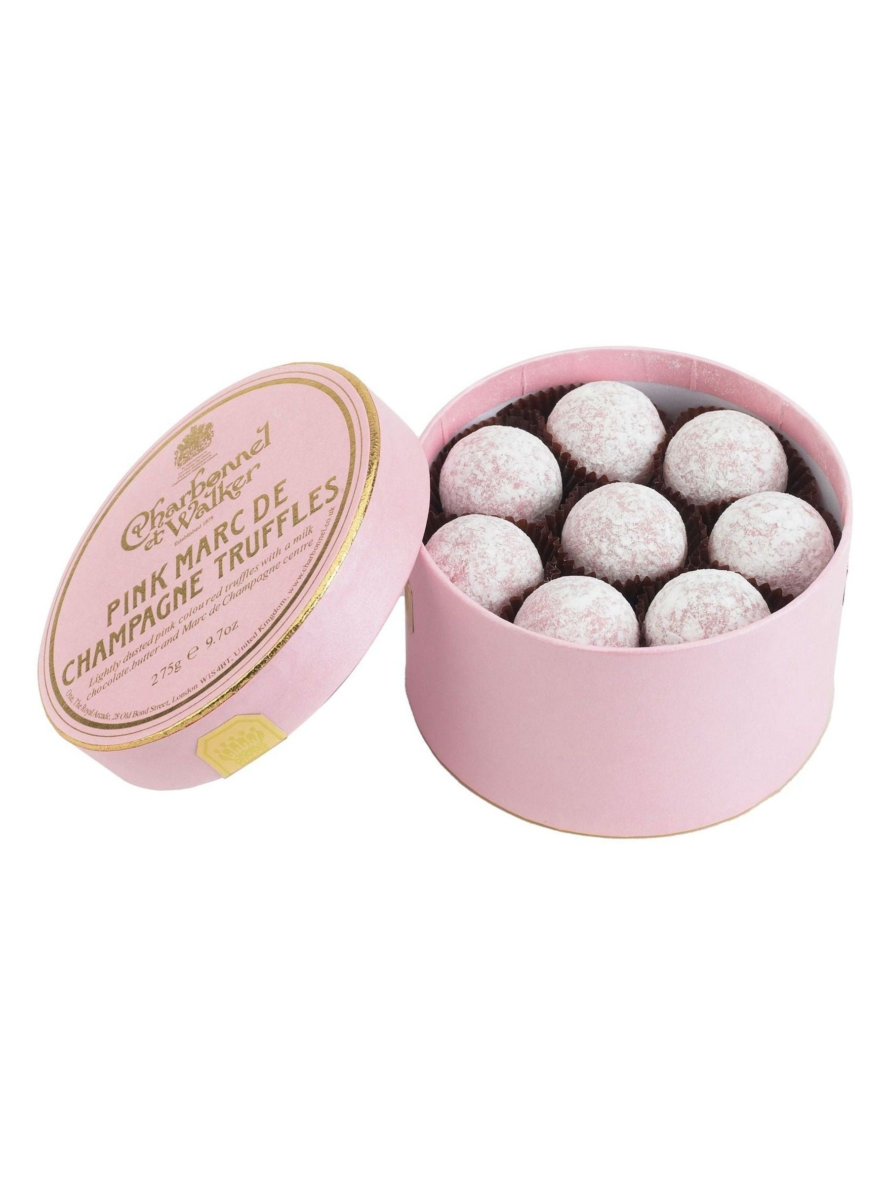 Exquisite Charbonnel Et Walker Pink Champagner-Trüffel, präsentiert in der legendären Charbonnel-Trüffeltrommel.