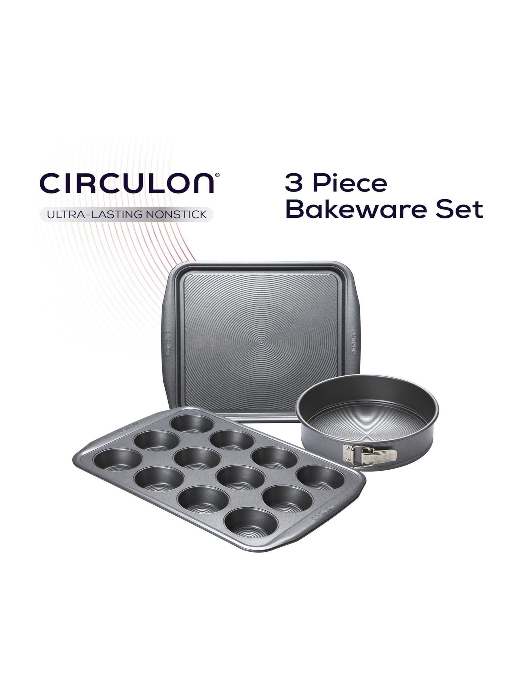 BAKING SET INCLUDES - 3 piece baking set with 30cm square baking tray, 12 cup muffin tin and 25cm Spring form cake tin TOTAL NON STICK SYSTEM - This bakeware set features Circulon's total non stick technology for easy food release and effortless cleaning. The hi-low groove system provides unrivalled cooking performance and non stick durability. OVEN AND DISHWASHER SAFE - This set of cake tins is oven safe up to 230°C and dishwasher safe for complete convenience. PFOA FREE - All the non stick surfaces on this baking set are safe and all PFAO Free, lead free and cadmium free. LIFETIME GUARANTEE - This durable bakeware set comes with Circulon lifetime guarantee for your complete peace of mind Circulon Momentum 0.6mm. Non-Stick Bakeware Designed with the confident baker in mind, each product comes with our unique Total Non-Stick System. It creates easy food release, saves time and effort and delivers perfect baking performance time after time. All our non stick surfaces are PFOA, Cadmium and Lead free. The 0.6mm thickness of each piece also resists warping in the oven and will heat evenly, giving you confidence in the kitchen.