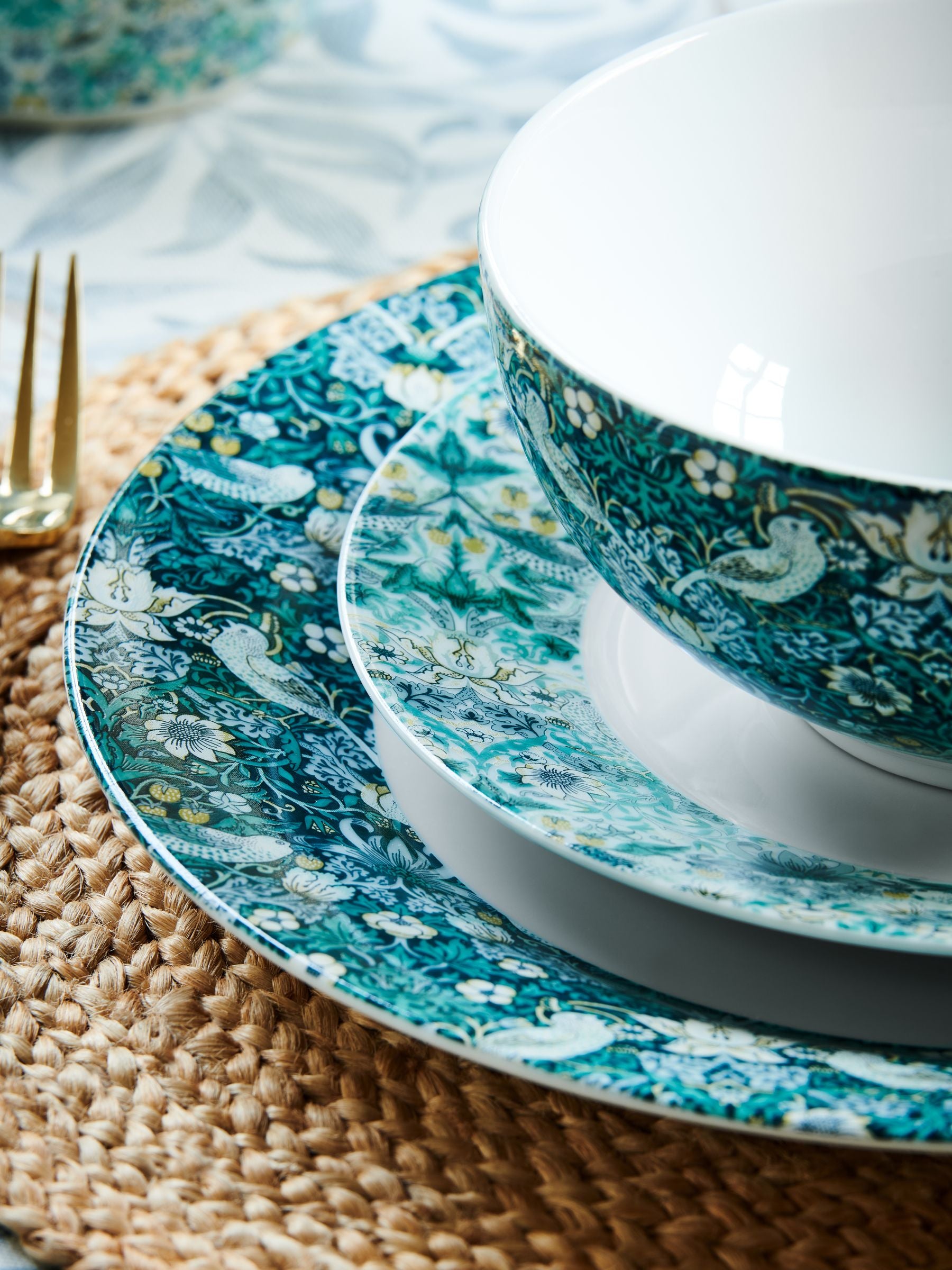 Verschönern Sie Ihre Tafel mit dem türkisblauen Strawberry Thief Speiseservice von Clarke & Clarke. Das Set aus reinem Porzellan ist mit William Morris' ikonischem Strawberry Thief-Muster verziert und besteht aus: 4 Speisetellern, 4 Desserttellern und 4 Müslischalen, alle in verschiedenen Türkisblautönen.