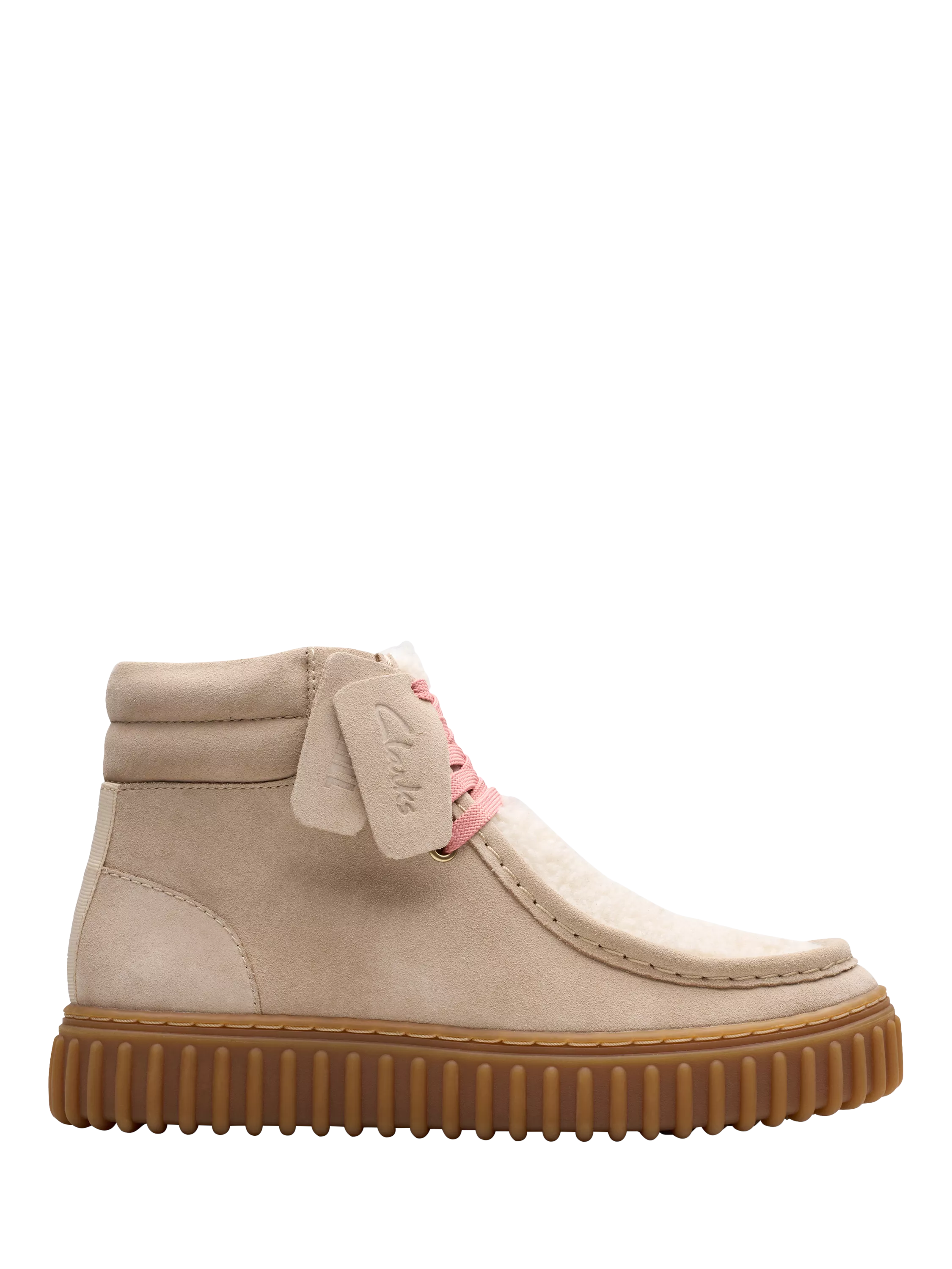 Die markante, gerippte Laufsohle, die diese Stiefeletten auszeichnet, stammt aus den Archiven von Clarks. Diese Stiefel präsentieren sich mit einem stromlinienförmigen Schnürdesign, dessen Kurven und Konturen an den legendären Wallabee angelehnt sind. Sie sind aus hochwertigem Wildleder gefertigt und mit aufwendigen Ziernähten sowie kontrastierenden Schnürsenkeln versehen. Inspiriert von traditionellen Modellen, verfügen sie über ein Obermaterial aus Shearling, ein gepolstertes Schaumstoff-Fußbett und eine strapazierfähige Laufsohle.