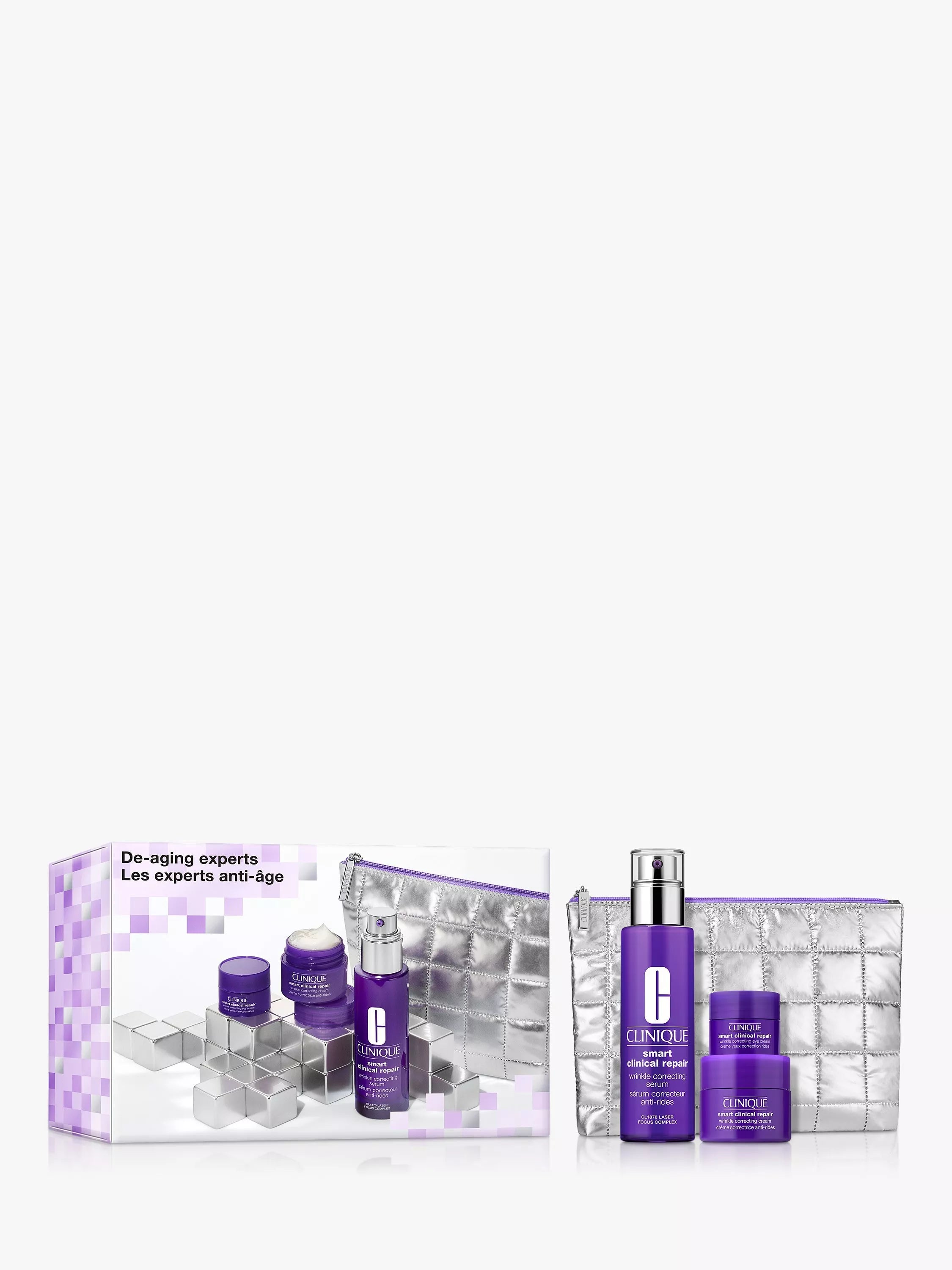 Dieses fortschrittliche Trio, das den Zeichen der Hautalterung entgegenwirkt, besteht aus vier Teilen: einem Smart Clinical Repair™ Faltenkorrekturserum in Originalgröße sowie einer Feuchtigkeitscreme und einer Augencreme in Reisegröße.