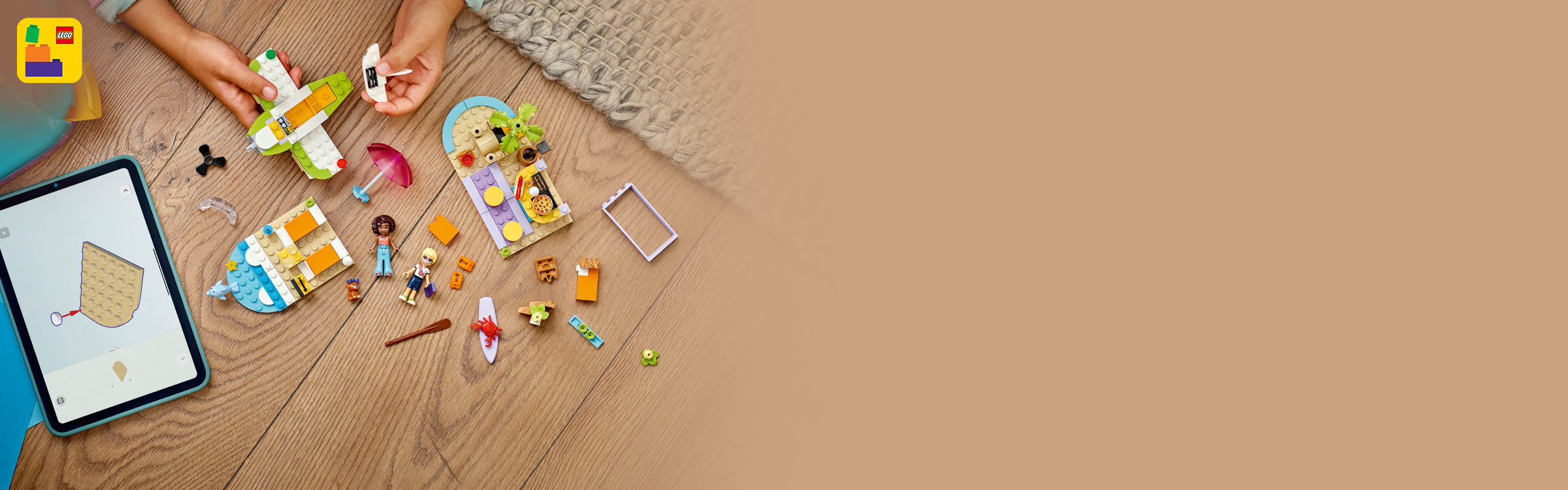 Dieses Spielset enthält alles, was Kinder zum Bauen eines Wasserflugzeugs mit drehbarem Propeller, einer Entspannungsecke mit Surfbrett und eines Strandcafés mit Sandburgen, Sitzgelegenheiten und Eiscreme-Zubehör benötigen. Die Modelle lassen sich in ein Schnellboot, einen Sitzbereich im Freien und eine Pizzeria mit Pizzaofen umbauen. Das Bauset enthält außerdem zwei Spielfiguren sowie einen Hund und einen Delfin für fantasievolles Rollenspiel.