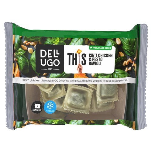 DellUgo THIS Isnt Chicken Pesto Ravioli offers a contemporary twist on fresh pasta dishes. These delicate parcels feature convincing plant-based chicken pieces blended with authentic PDO Genovese basil pesto. The components are carefully wrapped in high-quality fresh pasta for a satisfying quick meal.