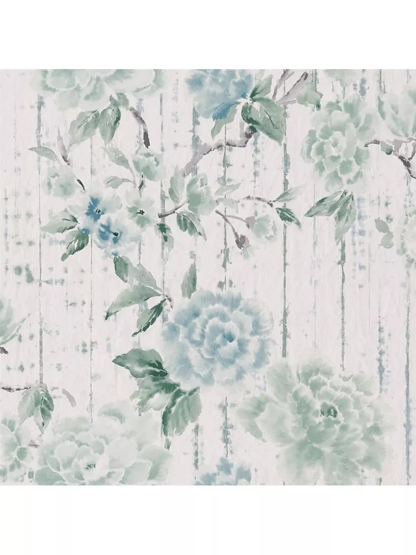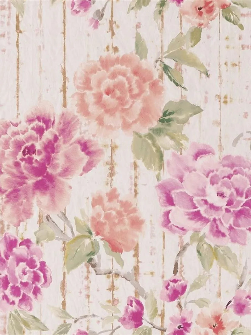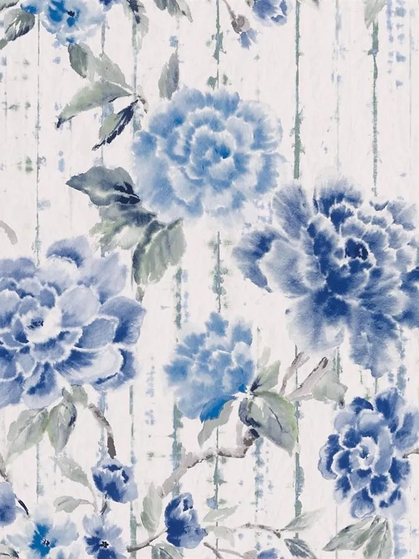 Diese elegante Blumentapete zeigt tiefblaue Darstellungen von Pfingstrosen und Rosen auf einem zarten, aquarellfarbenen Streifenmuster, inspiriert von der Frühlingsblüte in Kyoto. Sie ist im Tiefdruckverfahren auf ein Vliesgewebe gedruckt.