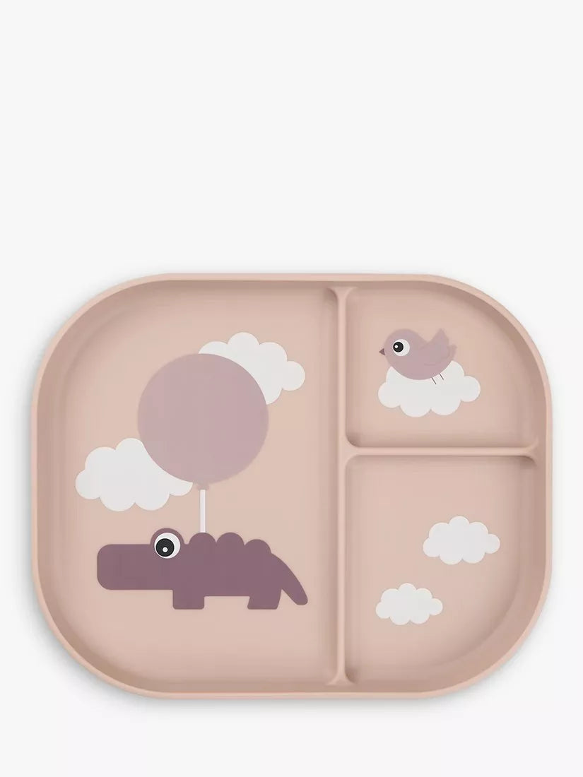 Der Teller ist mit einem verspielten Wolkenmotiv bedruckt. Croco und Birdee erkunden die Welt zwischen den Wolken und laden Ihr Kind ein, neue Geschmacksrichtungen und Konsistenzen zu entdecken. Der dunklere Farbton des Bodens sorgt für einen zweifarbigen Akzent.