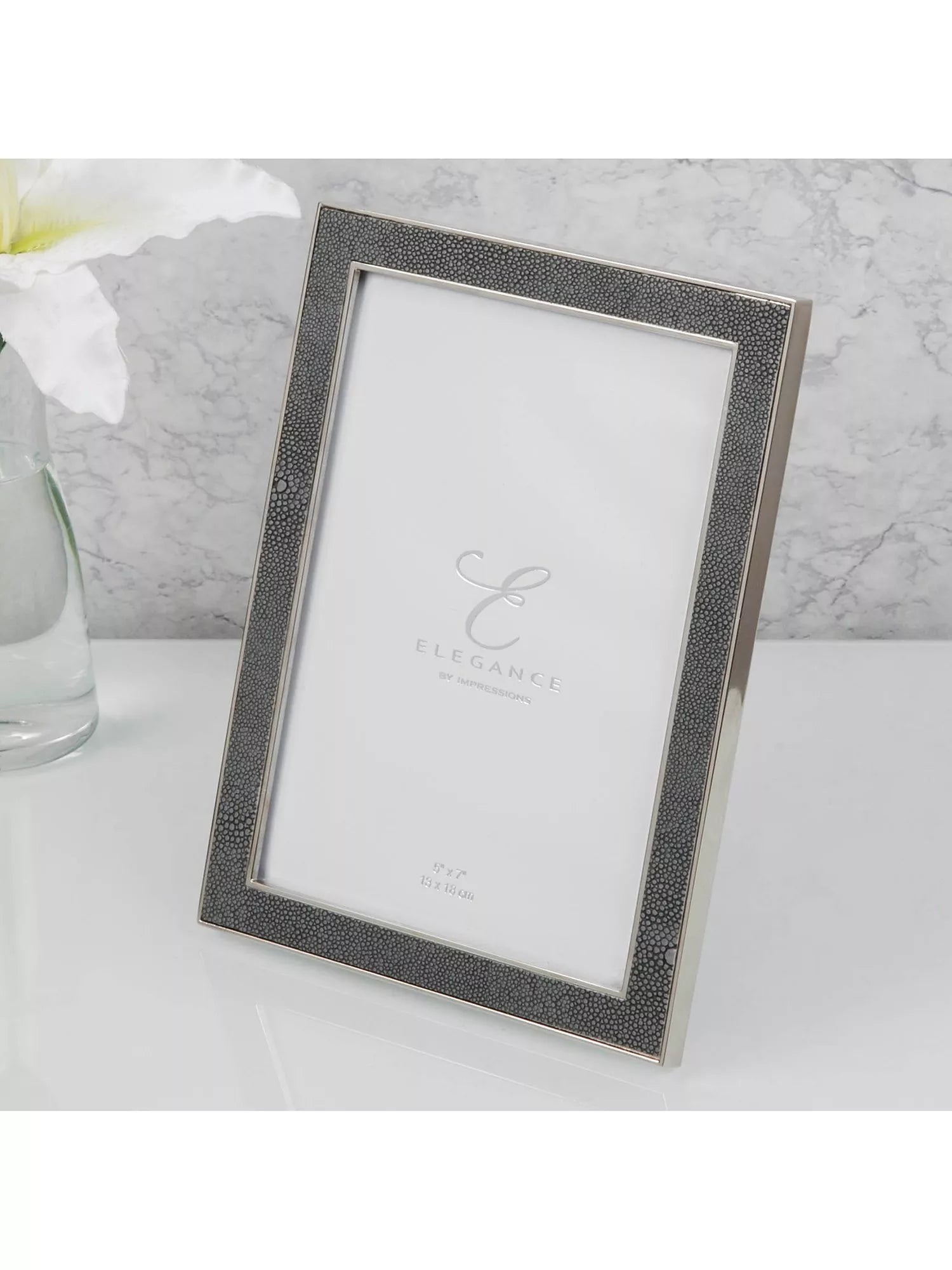 Ein vernickelter Bilderrahmen in Geschenkverpackung mit grauem Kunstledereinsatz von Elegance by Impressions. Der Rahmen kann dank des schwarzen Samt-Aufstellers freistehend, vertikal oder horizontal aufgestellt werden. Er wird in einer luxuriösen Elegance-Geschenkbox präsentiert.