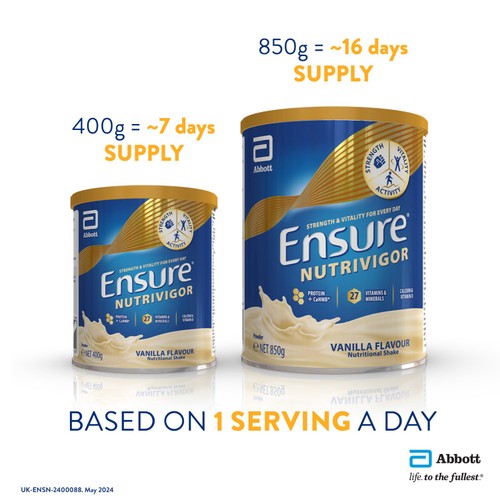 Ensure NutriVigor Vanilla Shake is a specialised food supplement formulated to support strength, energy, and immunity. This ready-to-drink formula contains 27 essential vitamins and minerals, alongside added protein and HMB. It is backed by 45 years of scientific evidence from the world's leading nutritional brand.