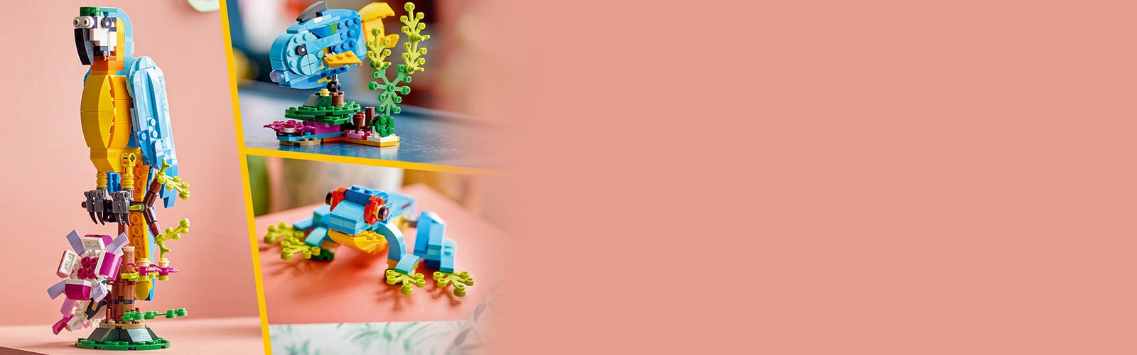 Mit diesem fantastischen LEGO 3-in-1-Set können Kinder drei verschiedene exotische Tierfiguren bauen. Sie können einen bunten Papagei auf einem Ast bauen oder ihn in einen verspielten Fisch verwandeln, der am Meeresgrund schwimmt, oder in einen frechen Frosch, der seine Beine bewegen kann.