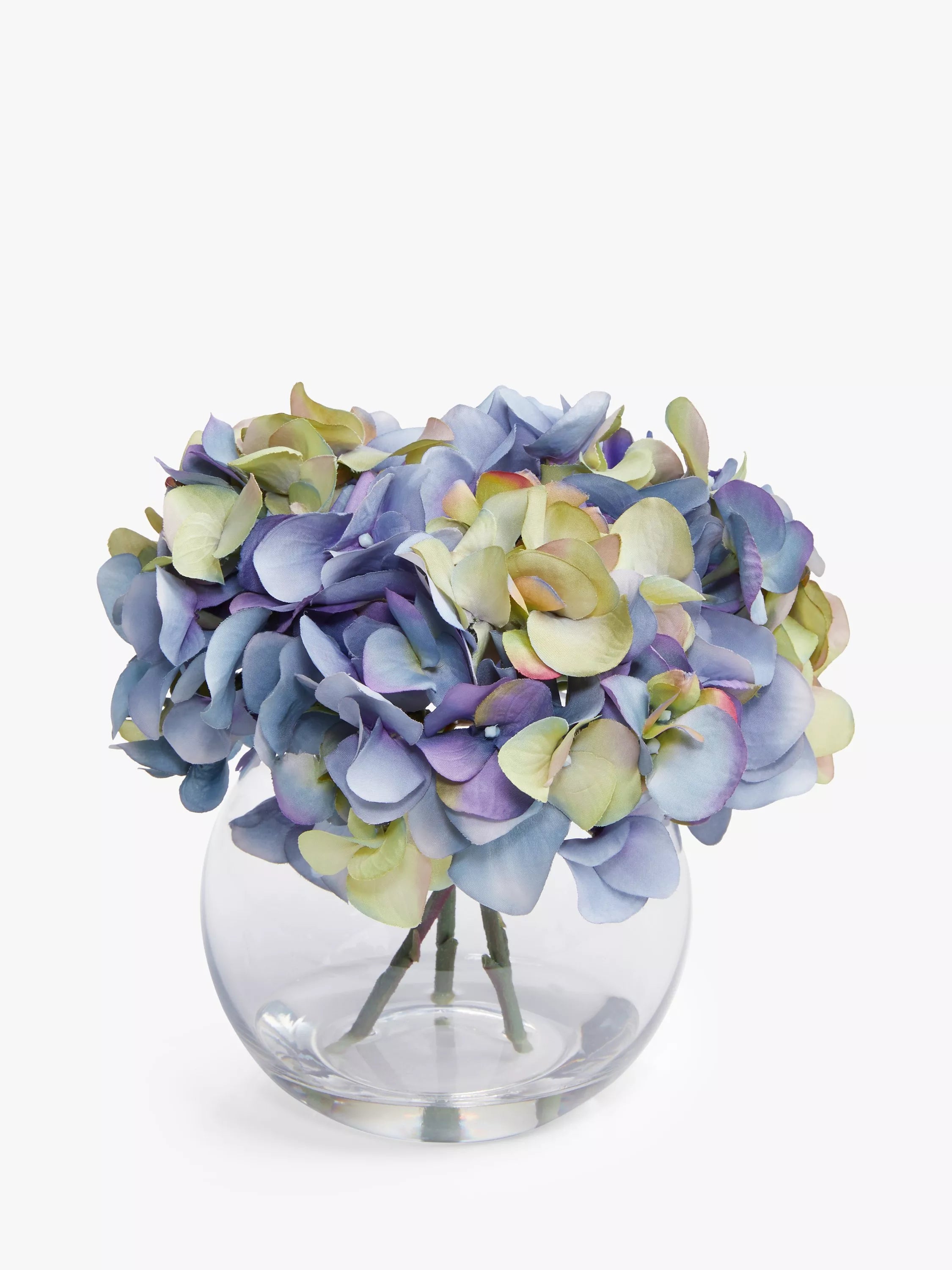 Wunderbar realistisch und das ganze Jahr über in voller Blüte. Hergestellt in Großbritannien von Floralsilk: Künstliche Hortensien in einer Glaskugelvase. Die Stiele sind in klarem Harz eingebettet und ergeben so ein fertiges Arrangement für jedes Interieur oder ein liebevolles Geschenk für einen besonderen Menschen.