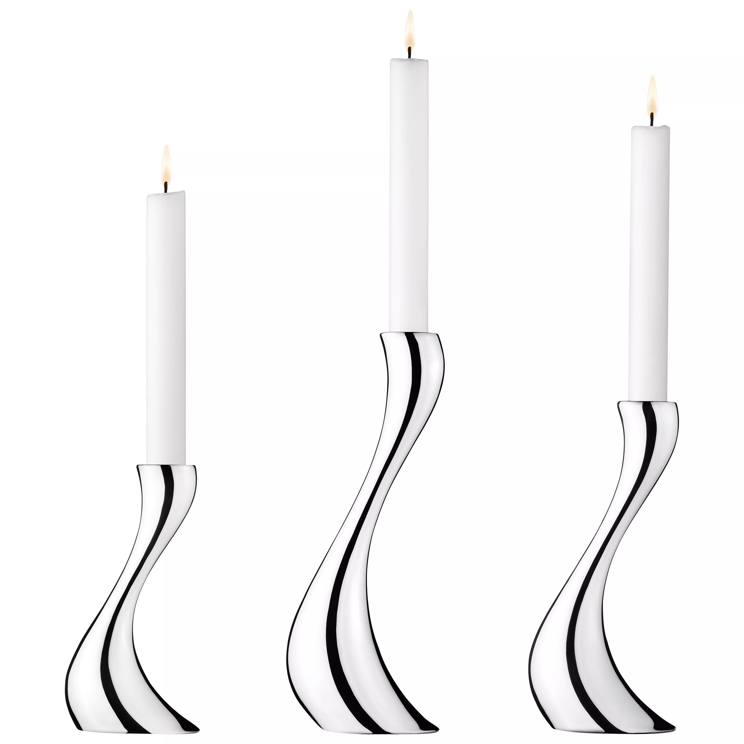 Dieses Trio geschwungener, schlangenartiger Kerzenleuchter erzeugt die Illusion von Bewegung. Sie sind ein Originaldesign aus Georg Jensens COBRA-Kollektion und aus robustem, makellosem Edelstahl gefertigt.
