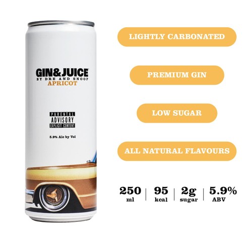 Experience Gin & Juice by Dre & Snoop, a lightly carbonated beverage made with real fruit juice and premium gin. These ready-to-drink options offer a sophisticated flavour profile crafted from high-quality components for immediate enjoyment.
