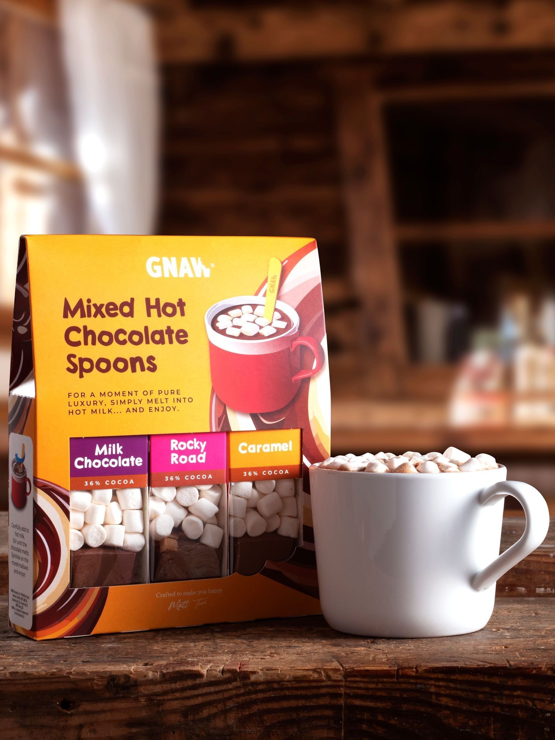 Ein Geschenkset mit drei Trinkschokoladenlöffeln in den drei beliebtesten Gnaw-Sorten: Milch, Karamell und Rocky Road. Jeder Löffel enthält Mini-Marshmallows. Einfach eine Tasse Milch erhitzen, den Löffel hineingeben und umrühren – fertig ist die köstliche Trinkschokolade. Mit den Marshmallows garnieren und genießen!