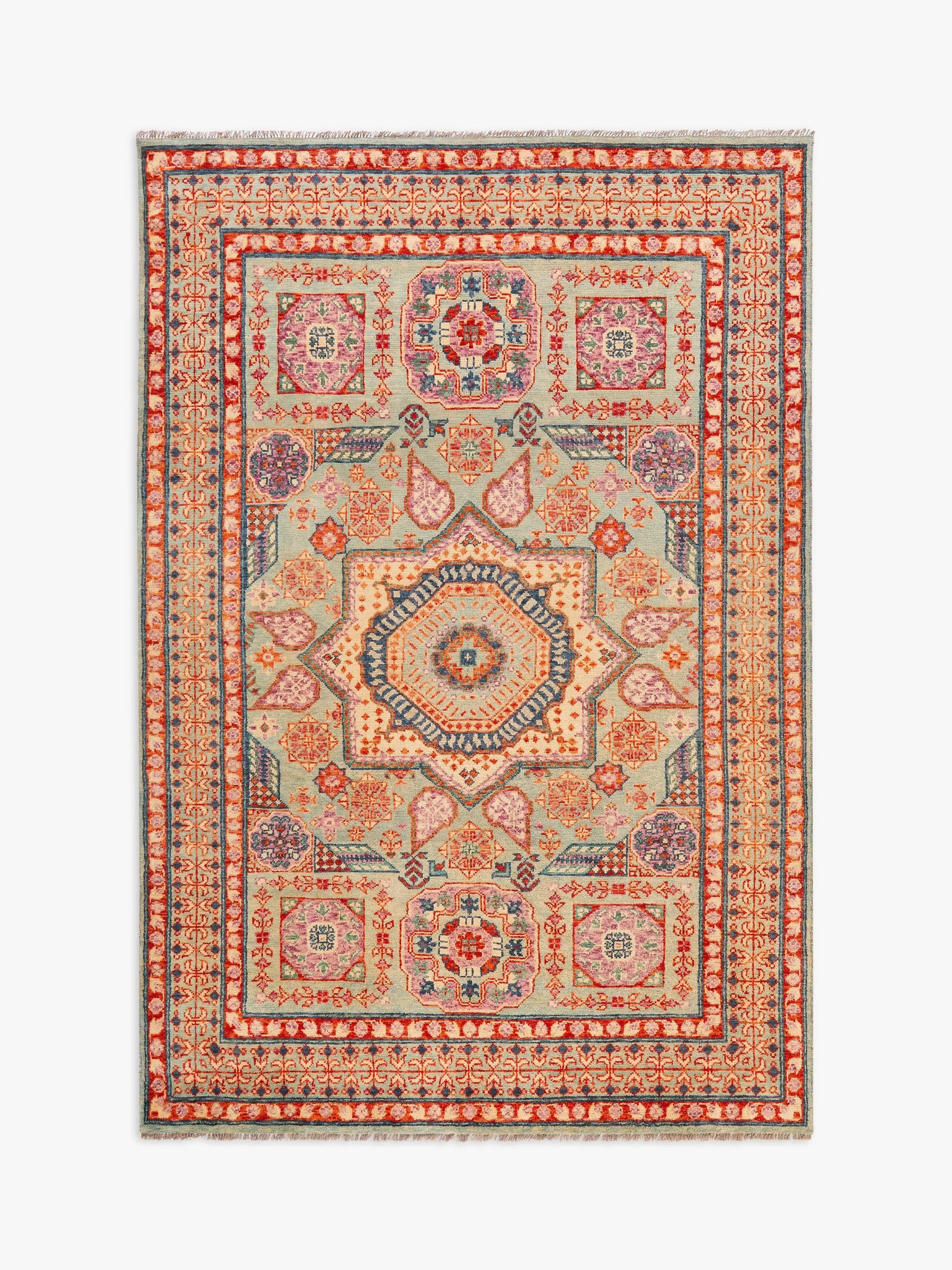 Dieser Teppich wurde von Hand geknüpft, der ältesten und individuellsten Art der Teppichherstellung. Dabei werden die Fäden in einem aufwendigen Prozess einzeln an einem Webstuhl verknotet, was dem Teppich seine Strapazierfähigkeit verleiht.