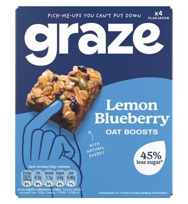 These Graze Lemon Blueberry Oat Boosts are flavourful flapjacks crafted using wholegrain oats and mixed seeds for a wholesome daily snack. The recipe includes manganese, which supports normal energy-yielding metabolism when consumed as part of a balanced diet.