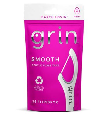 The GRIN Smooth Flosspyx deliver 36 units of effective interdental cleaning using gentle, smooth floss tape. These flossers feature a minty flavour to help freshen breath during use. The design incorporates a safe fold back pick for added versatility.