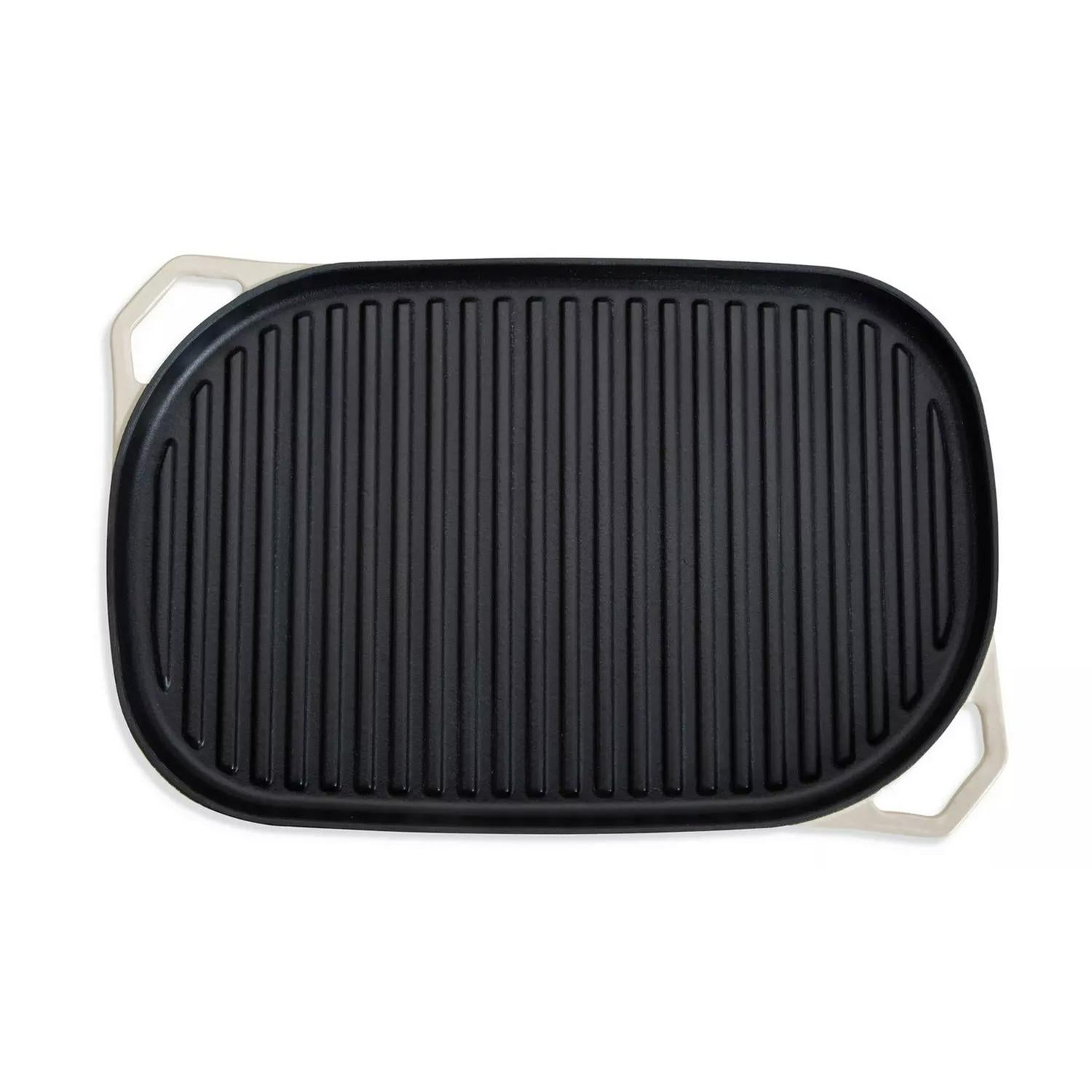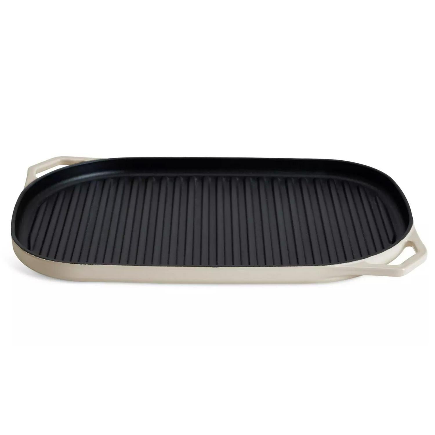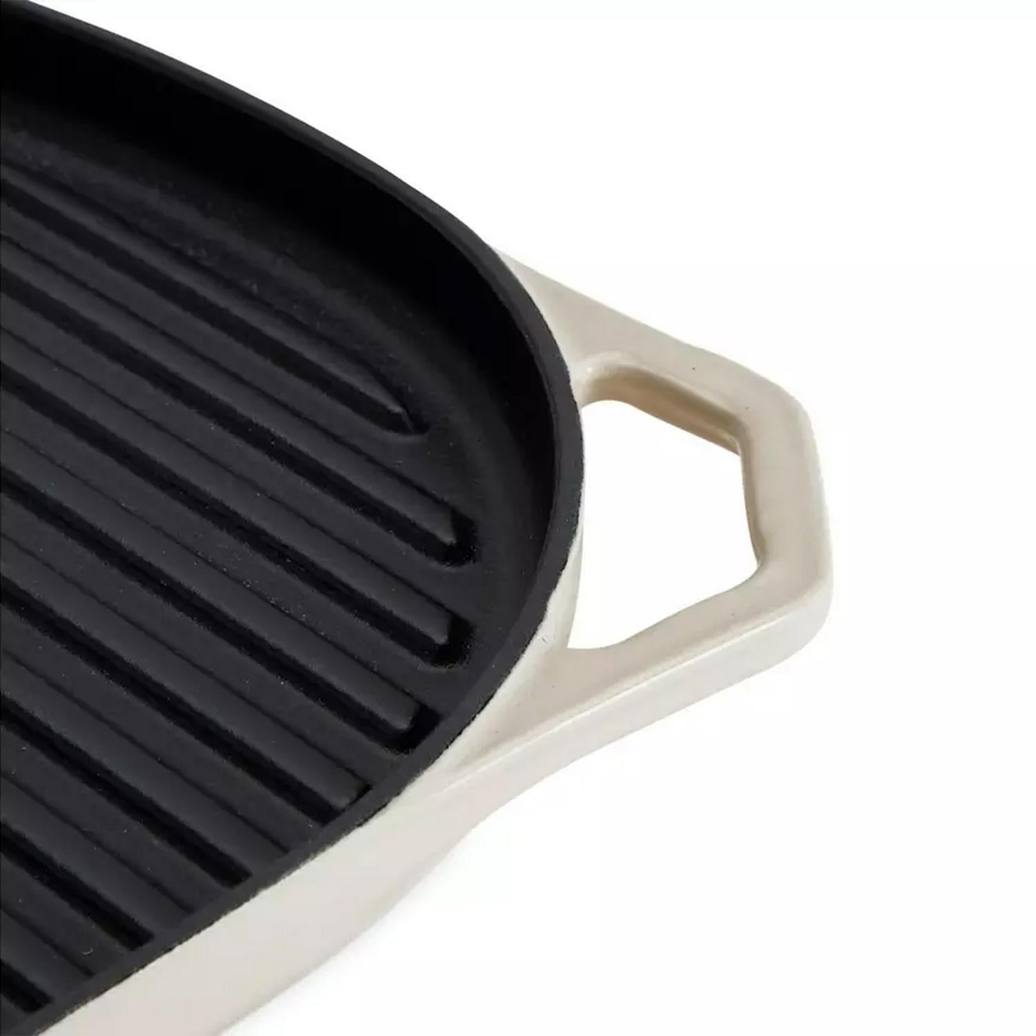 Achieve professional cooking results with this Habitat large cast iron grill pan, featuring a sophisticated cream enamel finish suitable for country kitchens. This pan is ideal for searing steaks, grilling fish, seafood, and vegetables evenly across its large surface. The durable cast iron construction ensures excellent heat retention and consistent cooking performance on any heat source.